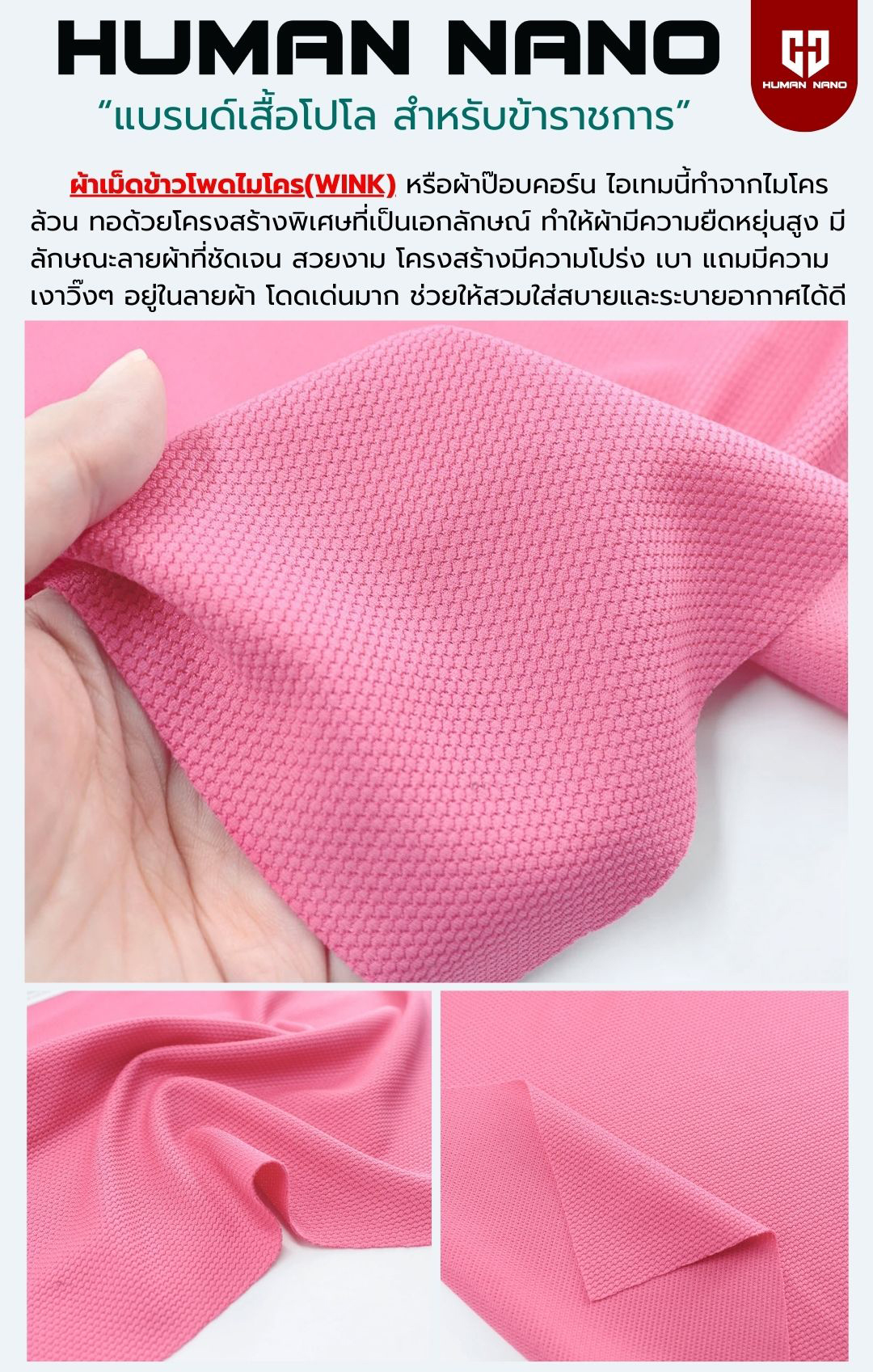 ผลิตจากผ้านาโนไมโคร(ลายเม็ดข้าวโพด) หน่วยงานราชการนิยมใช้กันมาก ทำเสื้อรุ่น เสื้อหน่วยงาน เนื้อผ้านุ่ม เบา ใส่สบาย ระบายอากาศ รูปทรงเข้ารูป แต่ไม่รัดรูป ใส่แล้วดูดี มีเสน่ห์ มีให้เลือกกว่า 15 สี